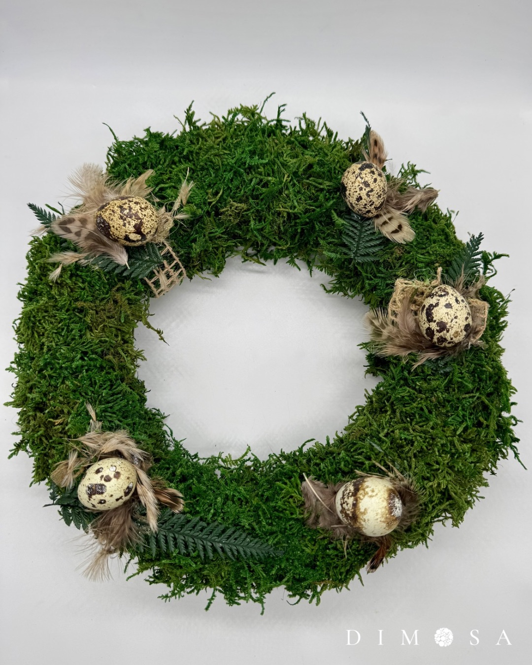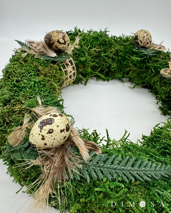 Ghirlanda naturale in muschio piatto conservato, decorata con uova di quaglia, piume e dettagli naturali – perfetta per la primavera e Pasqua.