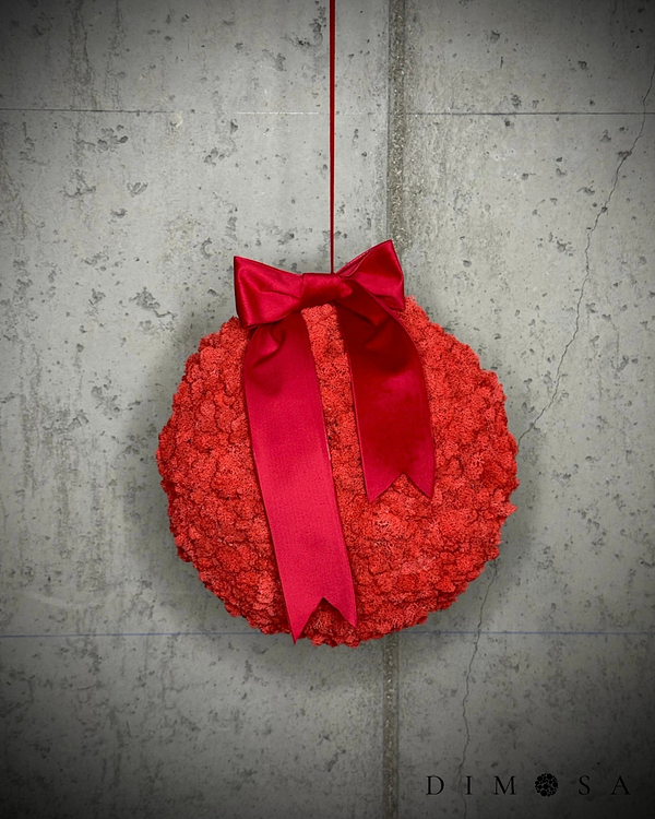 Sfera di muschio fatta a mano in rosso elegante con fiocco decorativo – un tocco di lusso per ambienti raffinati. Senza manutenzione e sostenibile.