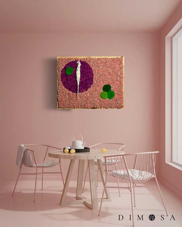 Das Moosbild „Pink Harmony“ ist ein ausdrucksstarkes Kunstwerk, das Farbe und Natürlichkeit perfekt vereint. Die Basis aus Rentiermoos in Pink und Fuchsia wird durch einen dekorativen Kreis hervorgehoben, ergänzt durch elegante Akzente aus Amaranthus und Kugelmoos in frischem Grün. Der Rahmen wurde in unserer hauseigenen Manufaktur aus hochwertigem Holz gefertigt und verleiht dem Bild eine exklusive Note. Gefertigt aus echtem, konserviertem Moos, bleibt es dauerhaft frisch und benötigt keinerlei Pflege. Ideal für Wohnräume, Büros oder repräsentative Bereiche – ein Statement für modernes Interior Design.