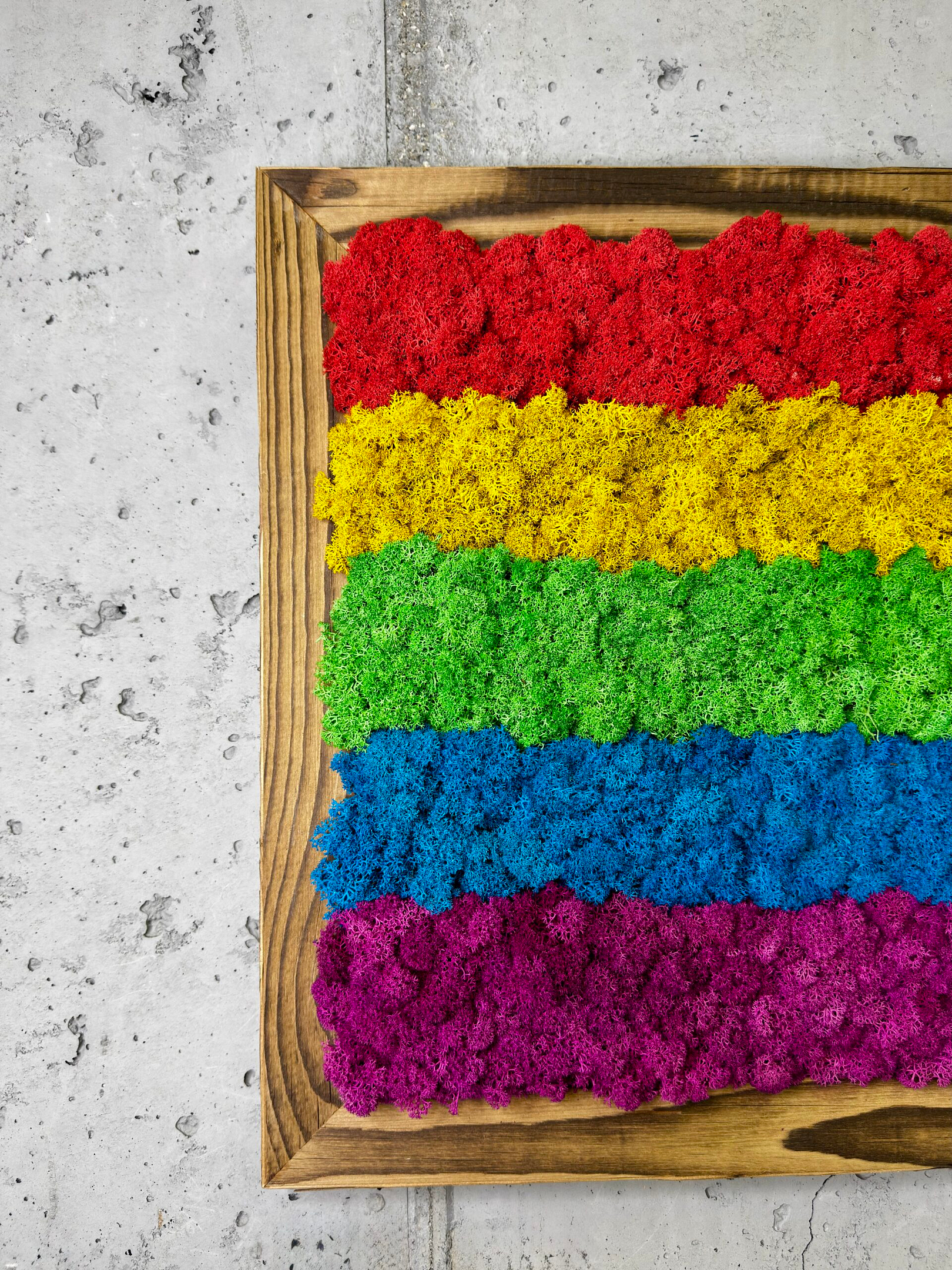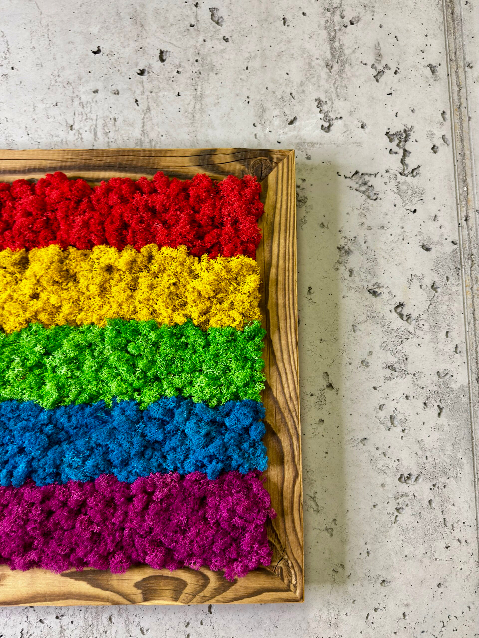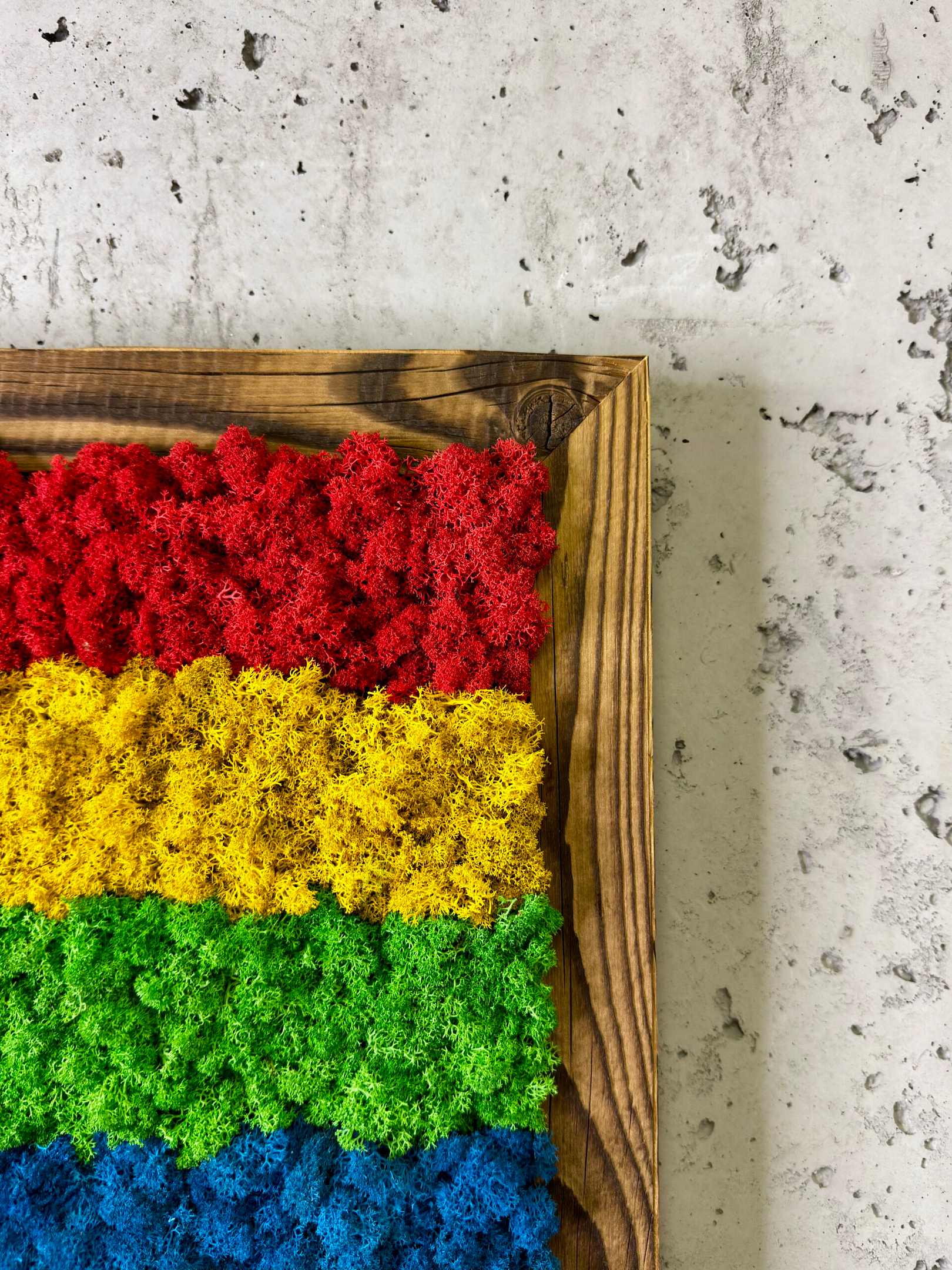 „Rainbow Nature“ ist ein Kunstwerk voller Energie und Emotion. Die kräftigen Moostöne – von frischem Grün über sonniges Gelb bis hin zu tiefem Blau – bilden einen natürlichen Regenbogen, der Lebendigkeit und Optimismus in jeden Raum bringt. Dieses Bild ist mehr als Dekoration: Es ist ein Symbol für Vielfalt, Harmonie und die Schönheit der Natur. Der Rahmen aus charaktervollem Altholz unterstreicht die Authentizität und macht „Rainbow Nature“ zu einem echten Statement-Piece für moderne Wohnräume, kreative Büros oder Orte der Inspiration. Pflegefrei und nachhaltig – ein Regenbogen, der niemals verblasst. Maße: 865 x 445 mm