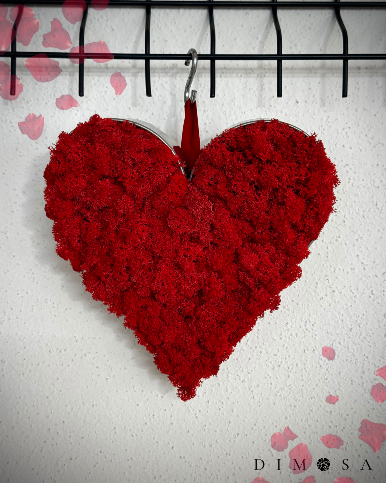 Un cuore di passione: realizzato a mano con muschio di renna stabilizzato e cornice in lamiera d’acciaio zincato. 100% fatto a mano – Made in Alto Adige.