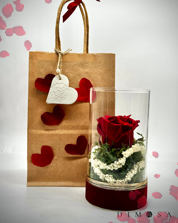 Una rosa senza tempo: rosa rossa stabilizzata in vetro, circondata da muschio e delicati accenti bianchi. Fatto a mano – Made in Alto Adige.